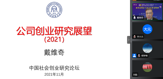 我院副院长戴维奇教授应邀在线上出席了创业管理学科发展研讨会,并作题为《公司创业研究展望(2021)》的大会报告。他对组织层面创业研究进行了较为系统的回顾,指出了2021年的最新研究进展,并对未来研究进行了展望。