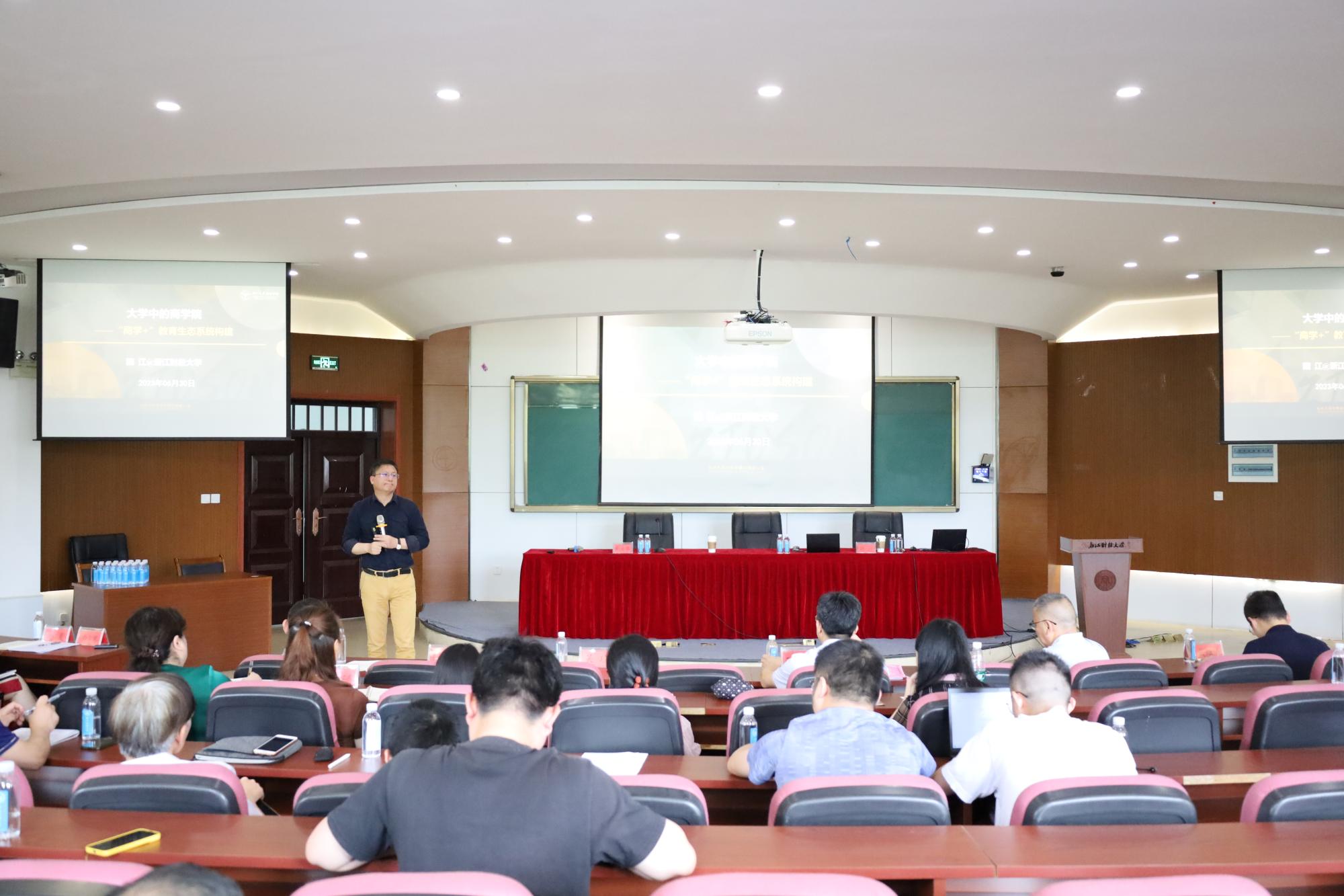 6月30日,为进一步深入学习贯彻习近平新时代中国特色社会主义思想主题教育,推动学院内涵式发展,工商伟德国际1946(MBA学院)邀请教育部长江学者特聘教授魏江给学院全体教职工作了题为“大学中的商学院---‘商学+'教育生态系统构建”的专题报告。会议由学院党委书记黄卫华主持。
