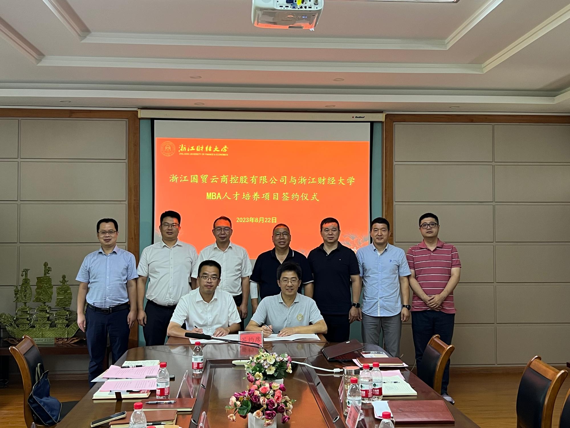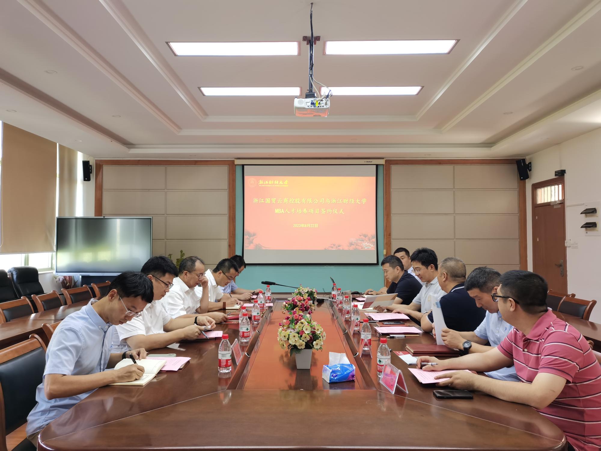 黄卫华在致辞中表示,经过学院与浙江国贸云商控股有限公司的多次交流与沟通,双方在MBA人才培养项目合作中达成了一致意见,这既是一个良好的开端,也是校企合作的又一个高端的起点,希望通过合作,优势互补,资源共享,达到双赢。濮志江对学校、学院在企业人才培养方面给予的支持和提供的平台表示感谢,他希望企业内员工通过进一步来校深造,可以成为一名懂财经的管理者,既懂经营也懂管理,既懂市场也懂营销,成为今后能担当公司发展大任的人才。王建明对校企双方即将开启一个良好的开端表示祝贺,并从师资力量、人才培养理念、课程设置优化、教学方式方法等多个方面介绍了MBA人才培养的情况和特色。