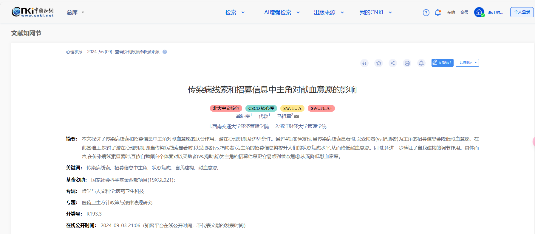 伟德国际1946马祖军教授作为通讯作者,撰写的“传染病线索和招募信息中主角对献血意愿的影响”被国内心理学领域顶级期刊《心理学报》录用并发表。
