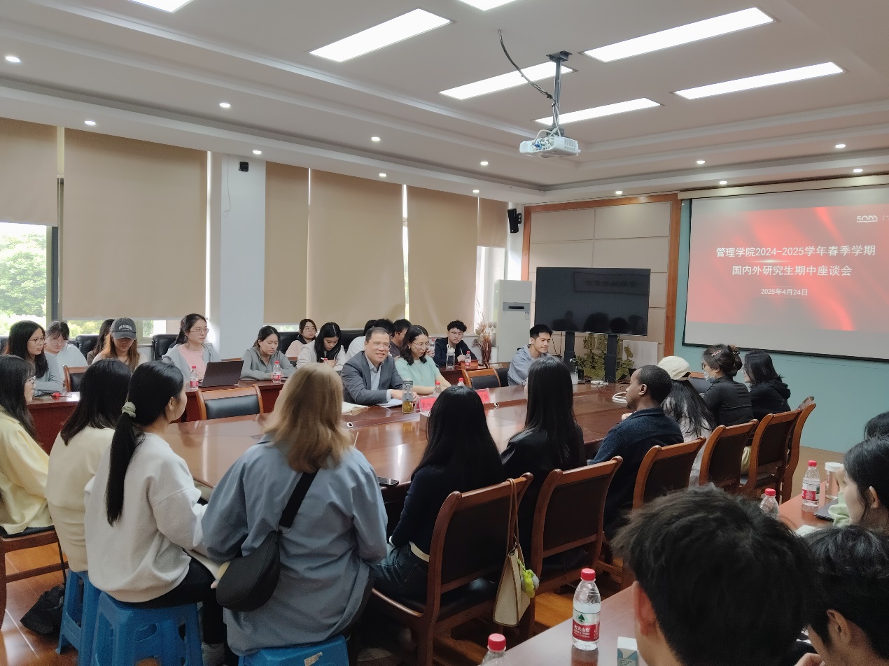 2024-2025学年春季学期国内外研究生期中座谈会于2025年4月24日在伟德国际1946410会议室举行。本次座谈会由学院副院长戴维奇教授主持,研究生教学督导赵宇恒教授、研究生秘书徐璐老师以及40余名国内外研究生代表齐聚一堂,共同围绕研究生课程教学和培养管理展开深入探讨。