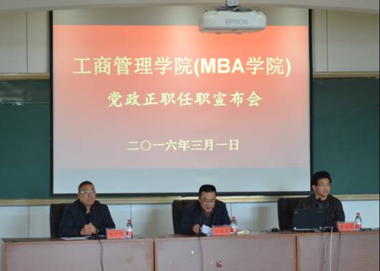 徐部长宣布学校党委任职文件,任命董进才为工商伟德国际1946(MBA学院)院长,黄卫华为工商伟德国际1946(MBA学院)党委书记,在会上徐部长传达了学校党委文件精神并提出三点建议:1、深入学习贯彻伟德国际victor1946第一次党代会精神;2、探索科学办学的新思路,3要积极探索党建工作的新机制。