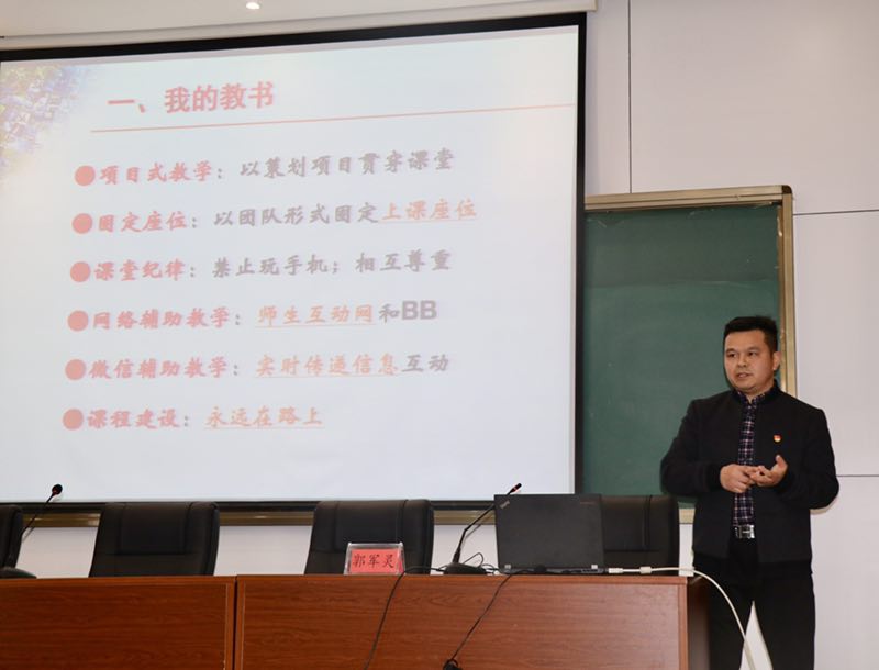 随后,郭军灵副教授以“教书育人:我的体会”为主题,从“我的教书”、“我的育人”、“我的体会”三大方面向在场同仁们介绍了从事营销教学工作多年来的心得。郭军灵副教授从创新课堂形式、实现新媒体教学、互动教学信息等多个角度分享了他努力成为学生成长成才的引导者的经验与体会。