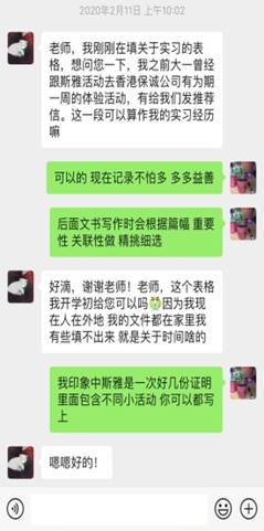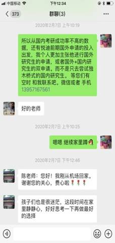 寒假里有越来越多的大四学生收到国外大学的录取通知书,面对学生的咨询,陈老师总是第一时间回复、指导学生如何进行选择。遇到低年级学生对自身发展规划的困惑和迷茫,陈老师也是细致耐心地同学生、家长一道进行沟通讨论。毕业论文写作过程中遇到问题了,专业学习有疑问了,或者询问返校时间了……等等,陈颖老师都保持充分在线,及时为学生们进行答疑解惑。