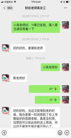 作为中美项目负责人,疫情期间,孔老师鼓励学生做好规划努力学习,积极准备考研,提升自己。和计划转入工商学院的学生家长沟通,讨论学生学习规划和升学计划。2016级中美市营林同学,在递交留学证明资料时出现了一些问题,孔老师通过微信语音和文字帮助其联系学校相关部门积极妥善处理,提出可行性解决方案。