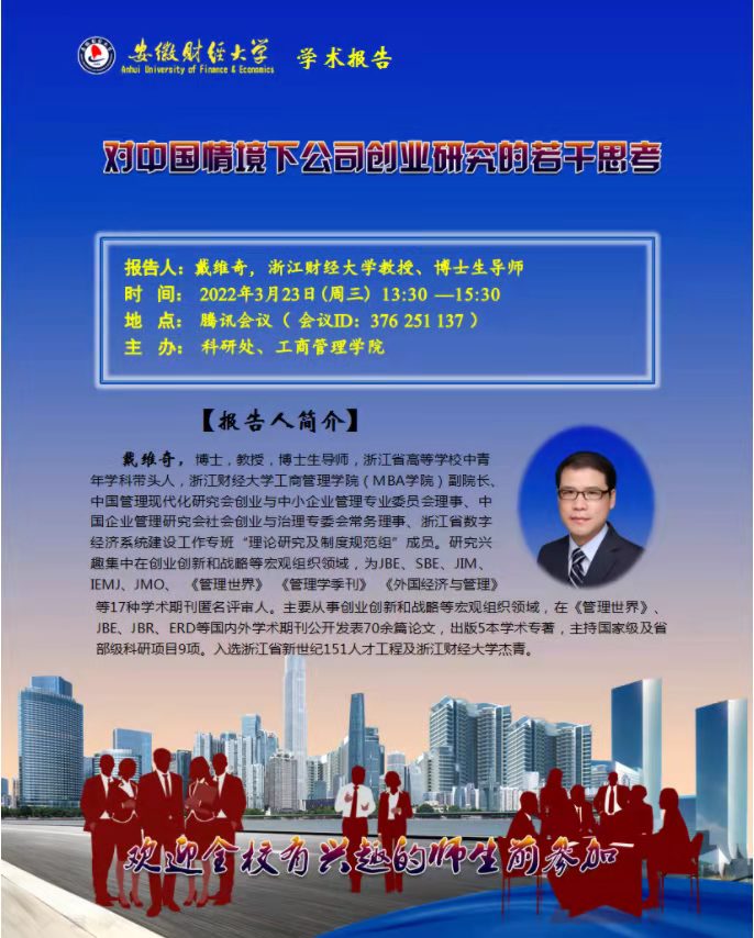 3月23日下午1:30,我院副院长戴维奇教授应邀为安徽财经大学师生做了一场题为《对中国情境下公司创业研究的若干思考》的线上学术报告。南开大学商学院张玉利教授对报告进行了专业点评。会议由安徽财经大学工商伟德国际1946副院长肖仁桥主持,来自南开大学、南京大学、安徽财经大学等院校的数百位专家学者以及研究生参加了此次学术报告会。