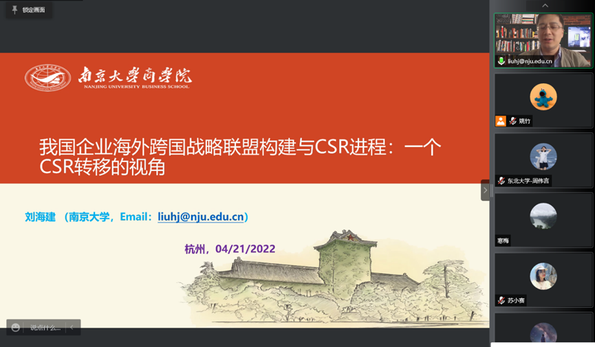 2022年4月21日,南京大学刘海建教授受邀为我院师生开展题为《我国企业海外跨国战略联盟构建与CSR进程:一个CSR转移的视角》的学术讲座。本次讲座通过“腾讯会议”平台在线上开展,吸引了校内外众生师生参加。本次讲座由副院长戴维奇教授主持。