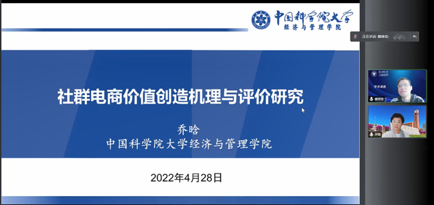 4月28日,中国科学院大学经济与伟德国际1946副院长乔晗教授受邀为我院师生作了主题为《社群电商价值创造机理与效率评价研究》的学术讲座。报告通过腾讯会议线上进行,学院老师、研究生参与该讲座。本次讲座由副院长戴维奇教授主持。