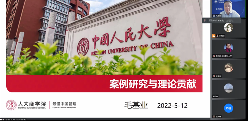 2022年5月12日,中国人民大学商学院毛基业教授为我院师生作题为《案例研究与理论贡献》的学术讲座。讲座通过“腾讯会议”平台在线上举行,吸引了200余位校内外师生的参与。本次讲座由我院副院长戴维奇教授主持。