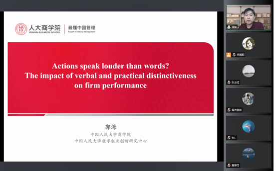 2022年5月19日,中国人民大学商学院郭海教授受邀为我院师生做题为《Actions Speak Louder than Words? The Impact of Verbal and Practical Distinctiveness on Firm Performance》的学术讲座。本次讲座通过“腾讯会议”线上举行,吸引了众多我院师生聆听。副院长戴维奇教授主持本次讲座。