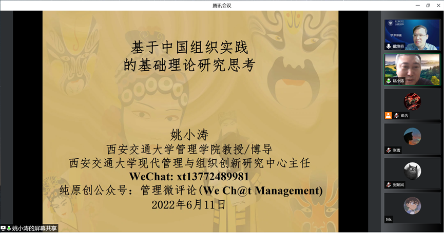2022年6月11日,西安交通大学伟德国际1946姚小涛教授受邀为我院师生作题为《基于中国组织实践的基础理论研究思考》的讲座。本次讲座通过腾讯会议在线上举行,吸引了我校师生以及外校学者110余人。讲座由副院长戴维奇教授主持。