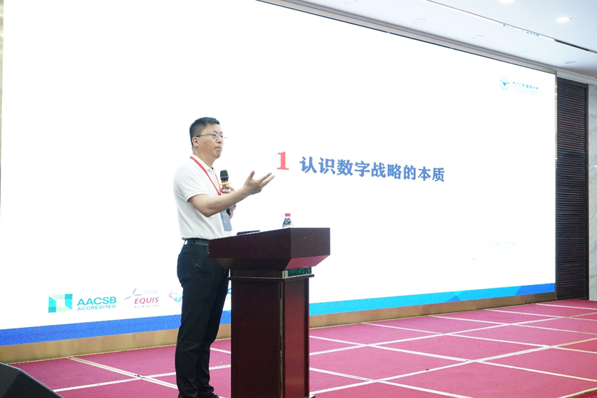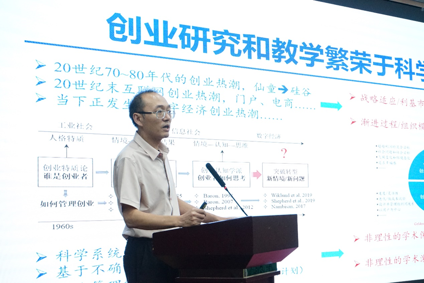 紧接着,王建明教授和戴维奇教授分别主持了四场主题报告。徐飞教授做了“创新创业与企业家精神”的主题演讲,他围绕“创新”“创业”“创新创业教育”这三个核心话题,强调创新创业教育对于个体、民族乃至国家的重大意义,点明创新创业永进不止。魏江教授带来了题为“数字创新与战略”的主题报告,他表示,企业战略的本质并未因数字时代的到来而改变,不过,随着数字技术的广泛应用,生产要素、产业组织形式、生产关系等发生了较大的变化,因而要求战略的形态进行改变。中国信息经济学会副秘书长兼数字经济创新联盟专业委员会主任、中山大学伟德国际1946肖静华教授,结合自身与企业深度互动共创研究成果的丰富经验,带来了题为“与企业共研共创,探索基于中国实践的理论”的主题报告,从共研共创的基础、机制和方式三个方面阐述研究者如何与企业家、管理者建立长期的合作,并形成有价值的研究成果。张玉利教授联合刘依冉博士发布了《全国高校双创教育教师调查报告》(以下简称《报告》)。为切实提升创业课程教学的有效性,真正发挥集体磨课的共创性,张玉利教授带领团队对全国31个省市自治区的1233名高校双创教师展开了调查研究。《报告》从创新创业授课教师队伍、知识体系、教学方法以及所处阶段等多个方面进行了一一分析,呈现出我国创新创业教育教师的真实面貌。之后,他就本次会议的具体安排做出说明,希望创新创业教育能从商学院走向整个学校并辐射社会。