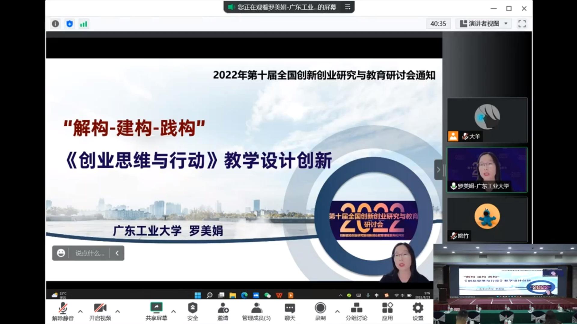 第二位分享的是来自广东工业大学的罗美娟老师。她在线分享了自己团队在创业思维与行动课程上的教学设计,通过分析创新创业教育的学情指出,重理论传授轻情境结合,重知识积累轻知识转化,重知识体系建构轻能力思维培养,是当下创新创业教育的痛点成因。接着,她强调创新创业教育要秉承“学以积智、思以践行、悟以立志”的教学理念,并总结出“解构-建构-践构”的教学模式和3W思政育人模式。对于课程学习的评价,罗美娟老师团队制定了详细的量表对学生学习效果进行评估。在交流讨论环节,罗美娟老师详细地解答了在创新课程教学实践中,知识与实践的关系应该如何协调。