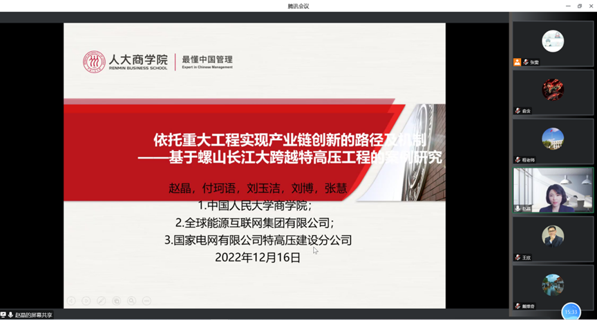 2022年12月16日,中国人民大学商学院赵晶教授受邀为我院师生作题为《依托重大工程实现产业链创新的路径及机制——基于螺山长江大跨越特高压工程的案例研究》的讲座。本次讲座通过腾讯会议线上举行,吸引了校内外四十余位师生的参与。讲座由副院长戴维奇教授主持。