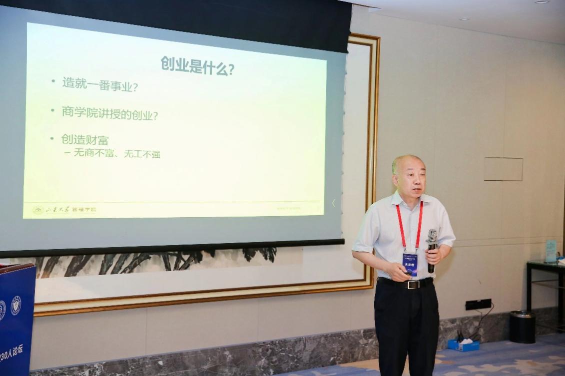 随后大会进入主题报告环节。南开大学创新创业学院院长、中国高等教育学会创新创业教育分会副理事长张玉利作题为《创新驱动创业——基于豪迈集团公司的观察思考》的主题报告。他以山东高密豪迈集团公司为例,从管理体系的独立性、管理体系的复制推广以及公司与员工的关系三方面出发,说明创新驱动创业是认知和思想的解放和创新,需要企业全员参与。同时,他强调开展情境独立的研究和基于管理实践的理论创新在当下中国是极为迫切的。