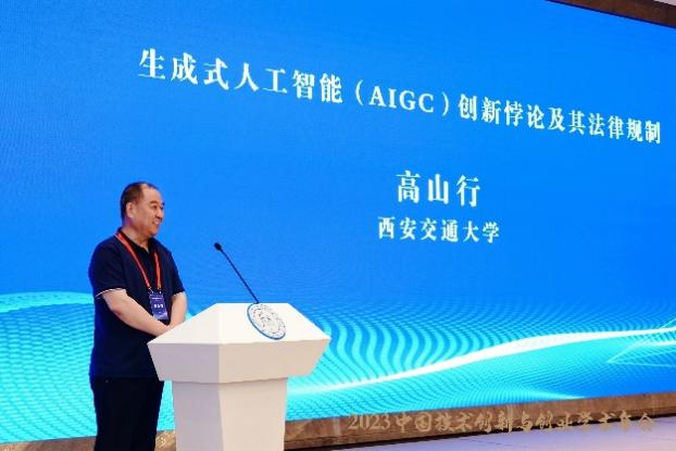西安交通大学伟德国际1946教授、国家社科基金重大项目首席专家高山行作题为《生成式人工智能(AIGC)创新悖论及其法律规制》的主题报告。高山行教授从AI发展对人类的影响、AI的走向、AI产生的问题及其规制的难点、AI规制的原因与方法、生成式人工智能创新悖论以及关于AI领域创新研究的思考六个方面展开论述。他指出,创新的研究将与更多的学科进行交融,与此同时学科的分类会逐步淡化,而从创新的角度来看AI有利于相关制度的设计。