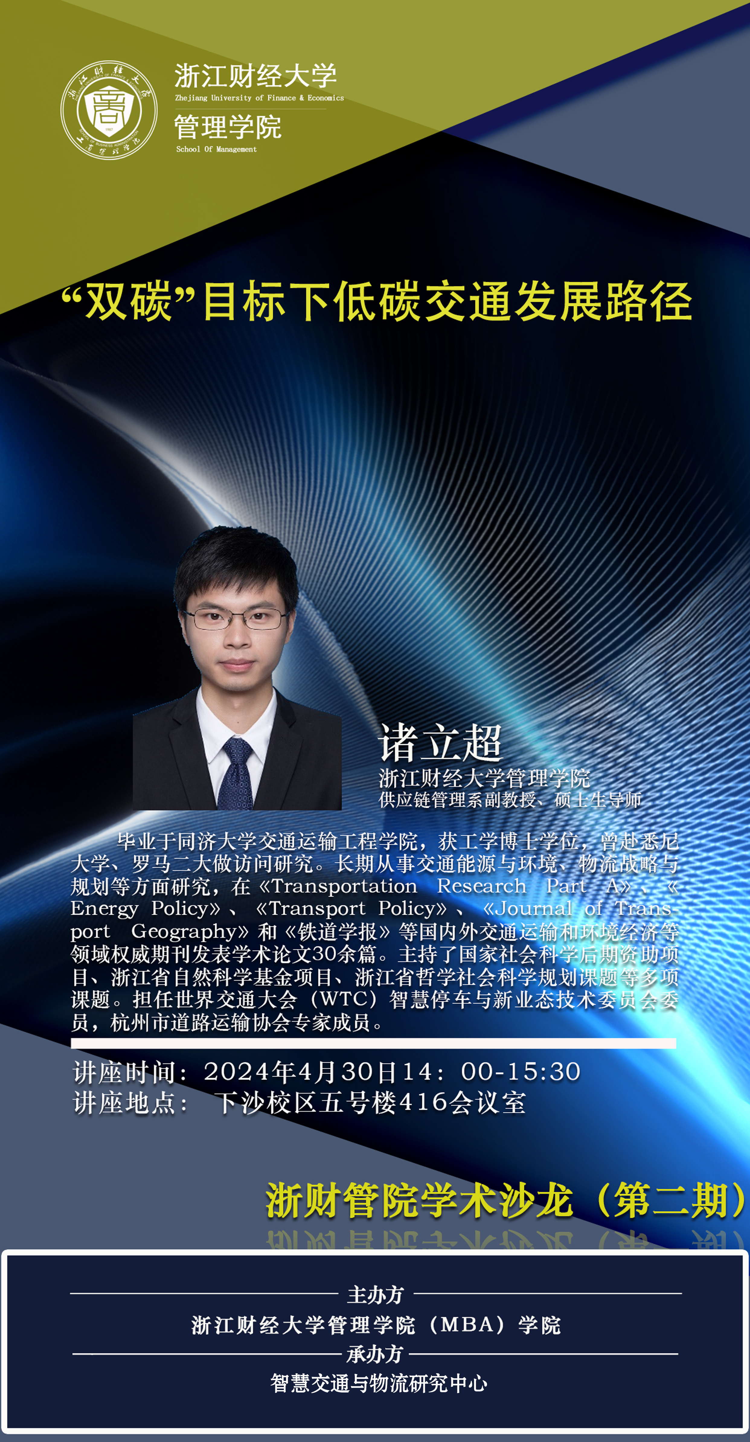 为助力我校“新财经”战略,落实“新学科”体系建设,加强伟德国际1946的科研工作。2024年4月30日下午,我院在5-416会议室举办了本学年第二期学术沙龙活动。供应链管理系的诸立超老师作了专题为“‘双碳’目标下低碳交通发展路径”的学术报告。