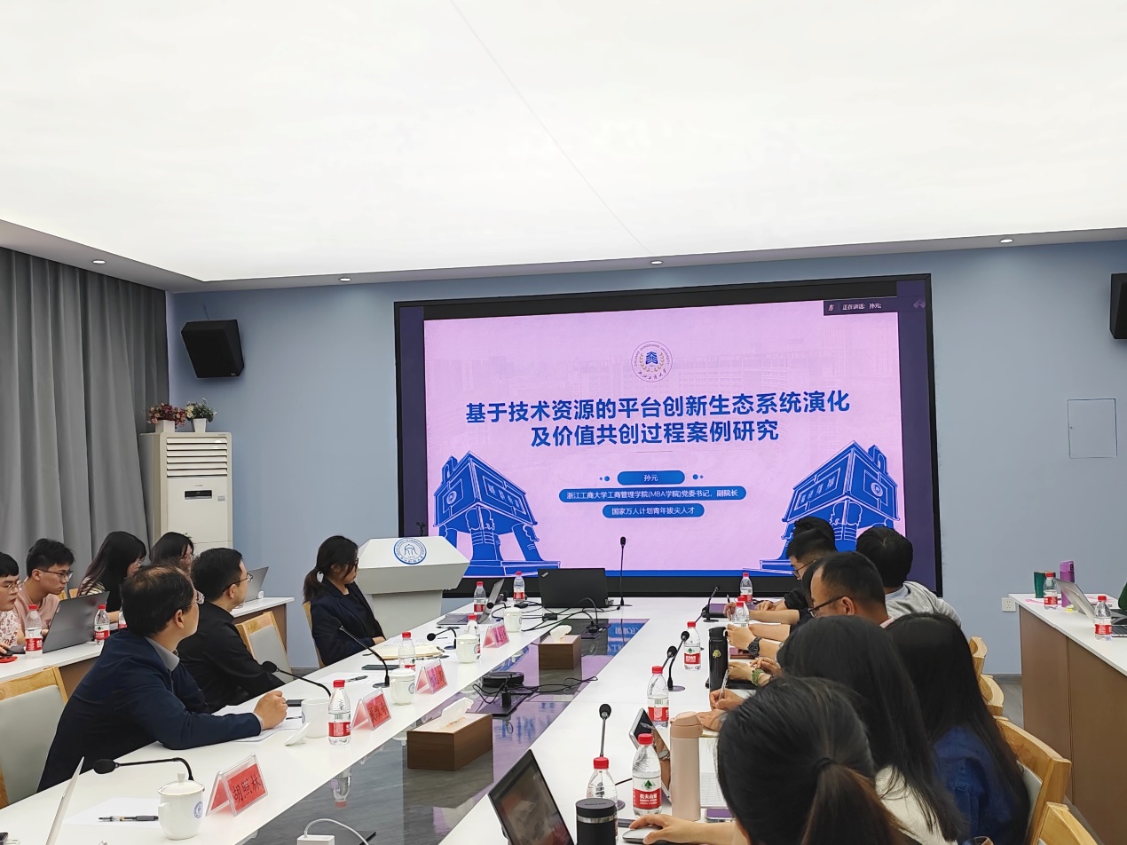 浙江工商大学孙元教授以“基于技术资源的平台创新生态系统演化及价值共创过程案例研究”为题,分享最近的研究成果。首先,孙教授从现实背景和理论背景两方面指出探讨基于技术资源构建创新生态系统具有重要的现实意义和理论意义。随后,孙教授表示不同特征的数字技术的资源整合方式可能存在不同,因而有必要进一步探究这些技术资源是如何被运用以发挥效用的。他借用资源编排的理论视角,将资源编排的过程分为资源结构化、资源能力化、资源杠杆化三个阶段,以此探究基于技术资源的创新生态系统的构建过程及价值创造模式。最后,孙教授认为基于技术资源的创新生态系统演化及价值共创的理论模型,不仅丰富了创新生态系统及资源编排两个领域的理论研究,也为基于技术资源的创新生态系统构建提供了实践启示。