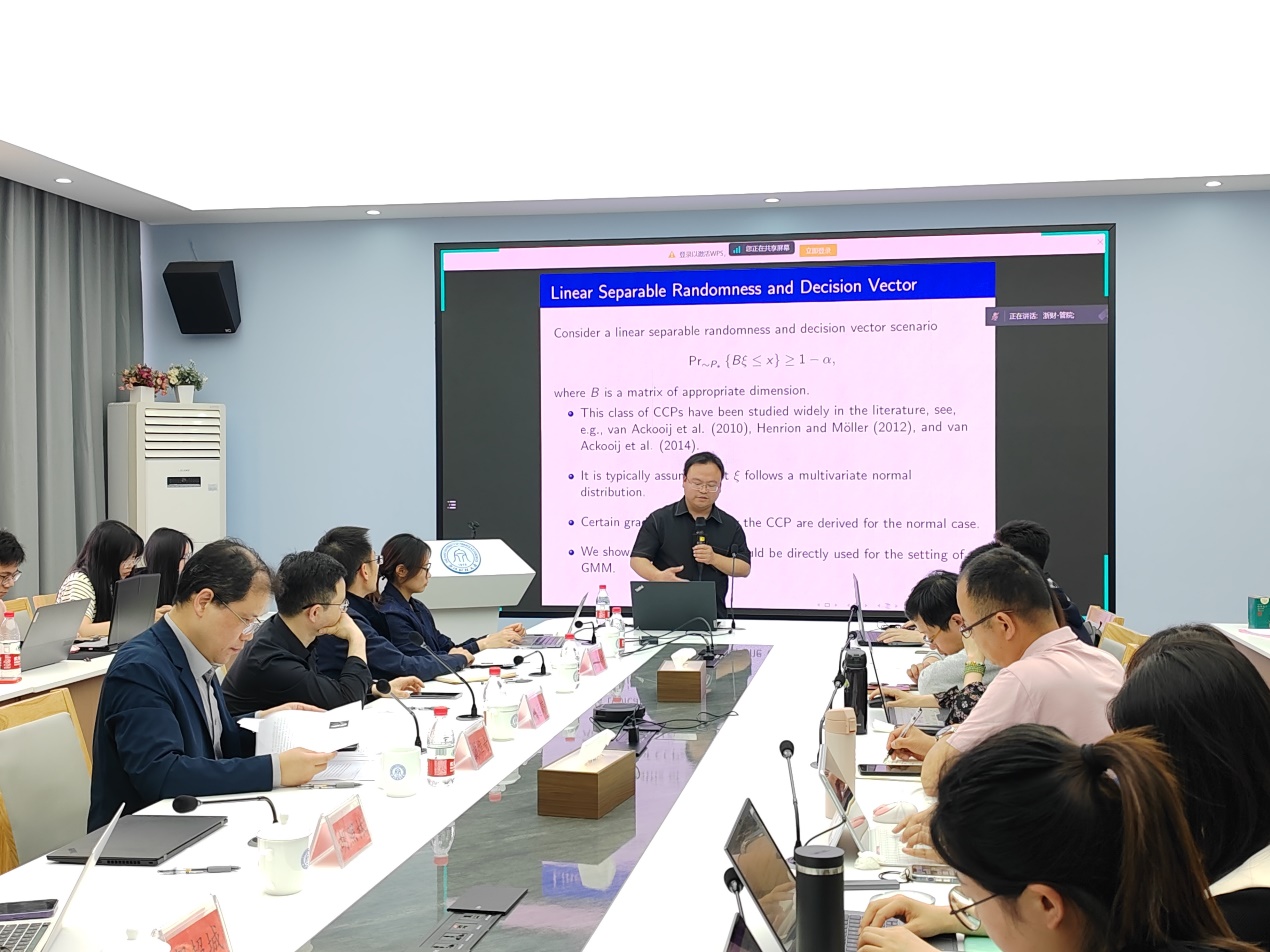 同济大学经济与伟德国际1946胡照林教授以“Chance Constrained Programs with Gaussian Mixture Models”为主题分享相关研究成果。胡教授结合了最近的两篇研究成果,就研究模型和问题方面进行阐述。在研究模型方面,胡教授讲述了机会约束规划模型的背景,以机会约束规划方法为代表,描述了模型的绩效化等方面。随后,胡教授根据不同问题给出了相应的目标函数和约束条件,并详细阐述了各约束、参数的含义。接着,胡教授阐明了联合机会约束规划和单个机会约束相结合的方法,并介绍了水库管理、电网优化等方面的现实问题应用,以及“Gaussian mixture”在机器学习等方向上的理论运用,明确了研究问题方向。最后,胡教授介绍了不同类型的机会约束规划,介绍了梯度简化等方法,并讲述了工作所取得的成效,总结了方法的优势。