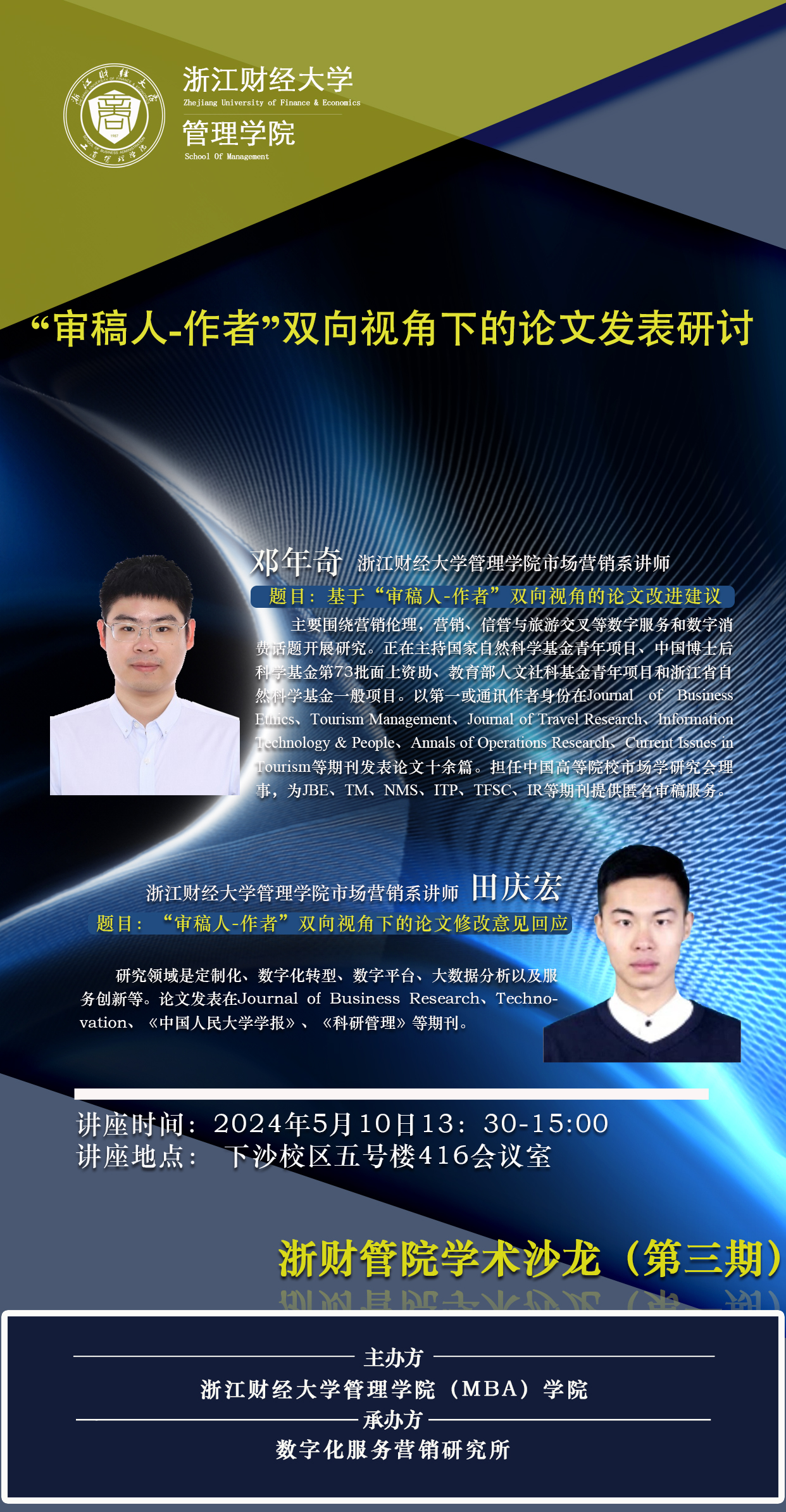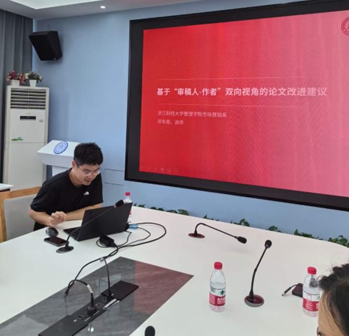 为助力我校“新财经”战略,落实“新学科”体系建设,加强伟德国际1946的科研工作。2024年5月10日下午,我院在5-416会议室举办了本学年第三期学术沙龙活动。市场营销系的邓年奇老师和田庆宏老师作了专题为“审稿人-作者”双问视角下的论文发表研讨”的报告。本次活动由高键老师主持,市场营销系主任陈颖和各位老师出席了本次活动。