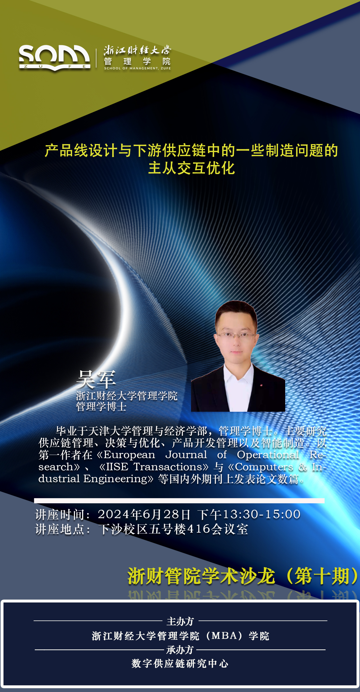 6月28号下午,我院第十期学术沙龙活动由吴军老师分享个人研究成果。此次会议由数字供应链研究中心闫强老师团队承办,张雷教授、闫强老师等供应链系的多位老师和其它各系的多位老师参加了此次学术沙龙会议。
