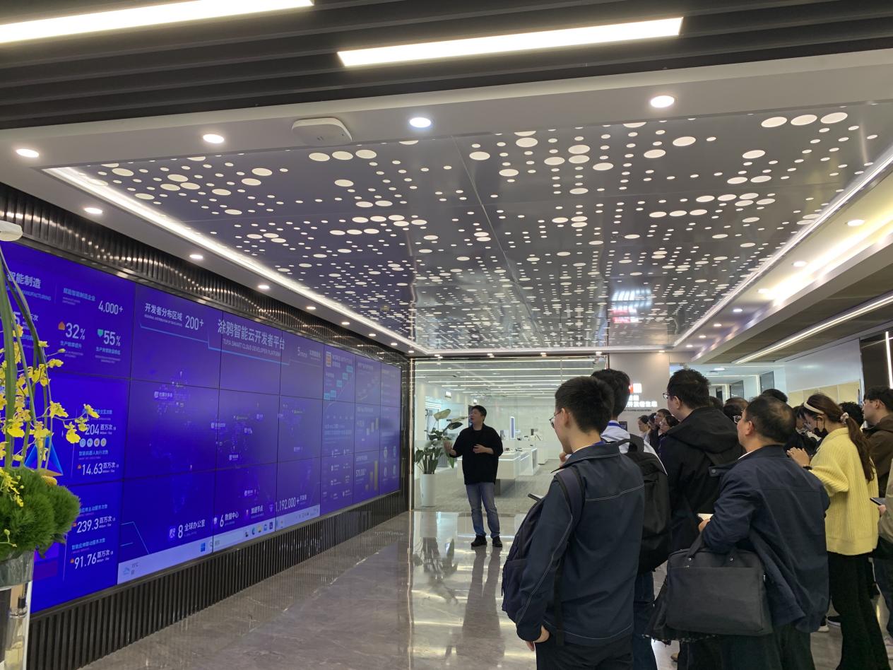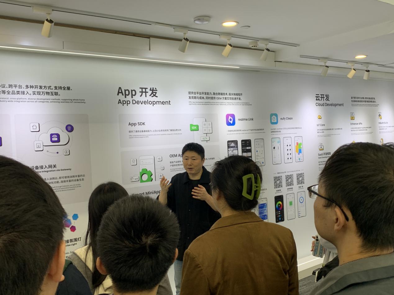 参访活动的第一部分是参观企业各个区域。首先,在刘帆副总裁对涂鸦智能云开发者平台的介绍下,参访团队初步了解了涂鸦公司的业务板块,认识到涂鸦智能云开发平台在智能设备领域所展现出的创新性。