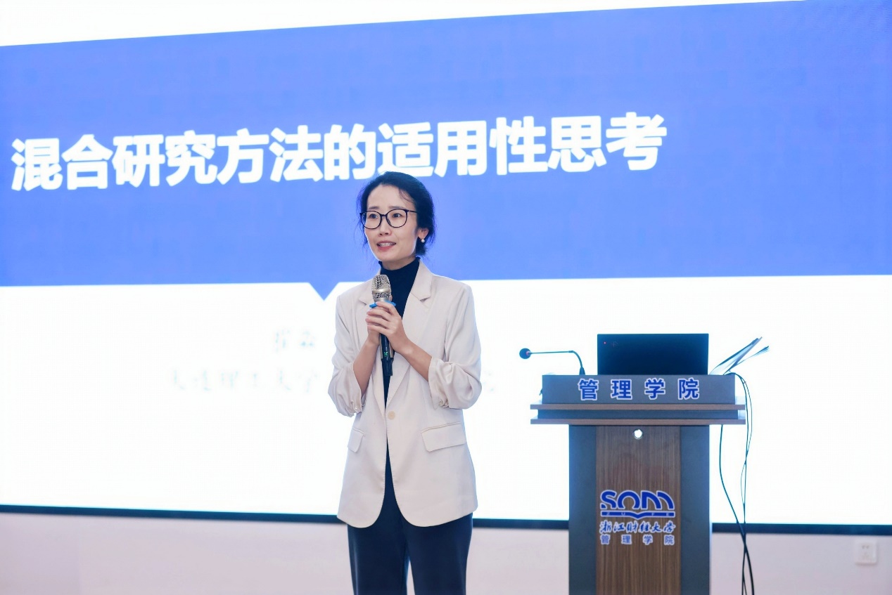 田莉教授指出,混合方法研究可以结合归纳和演绎的两种逻辑,从现象中找到最佳的解释逻辑。她提出了两种方式,第一种是量化研究为主,质性研究为辅:在量化研究基础上加上质性研究,以强化验证“测不到”的机制;第二种是质性研究为主,量化研究为辅:运用质性研究探索理论机制,再通过量化研究检验质性研究的结果,增强说服力。同时,田莉教授向在座的学者们分享了她目前正在撰写的采用混合方法研究的论文。