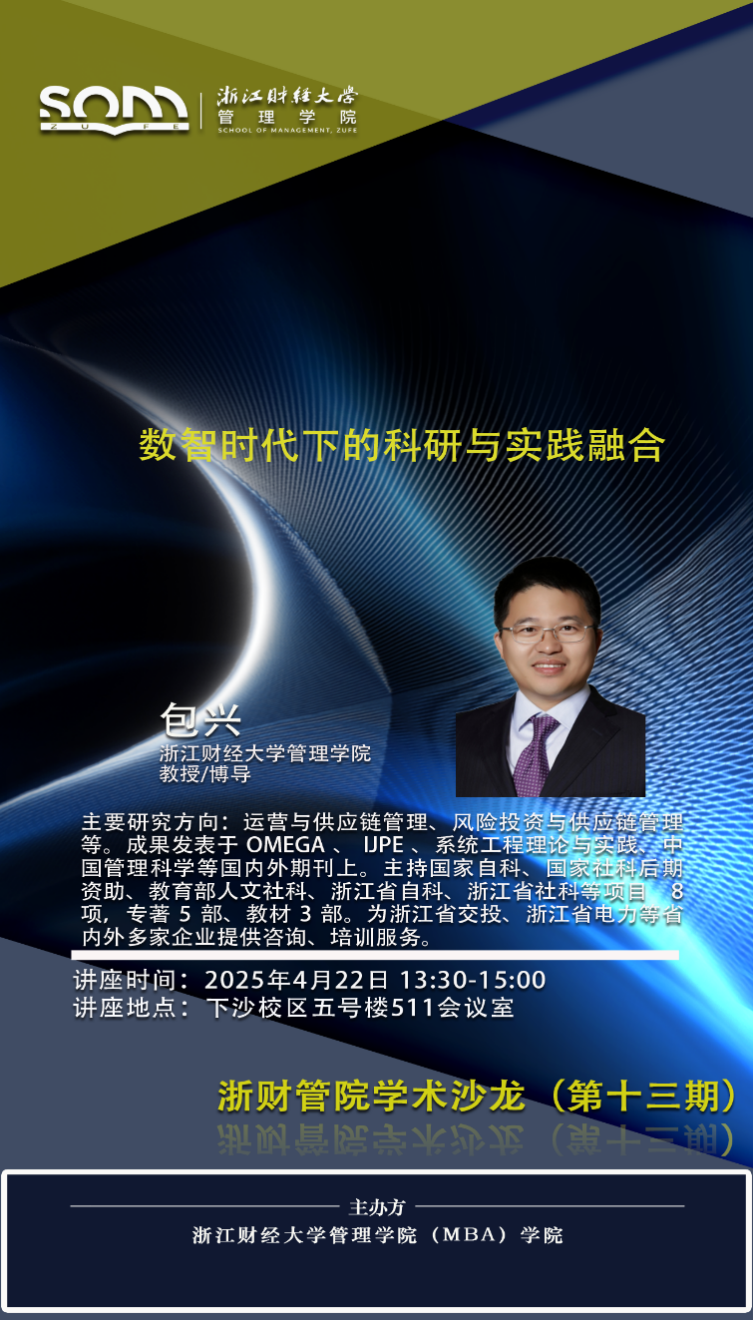 为助力我校“新财经”战略,落实“新学科”体系建设,加强伟德国际1946的科研工作。2025年4月22日下午,我院在5-218会议室举办了本学年第十三期学术沙龙活动。我院包兴老师作了专题为“数智时代下的科研与实践融合”报告。本次活动由马祖军老师主持,供应链管理系主任李晓超和各位老师出席了本次活动。
