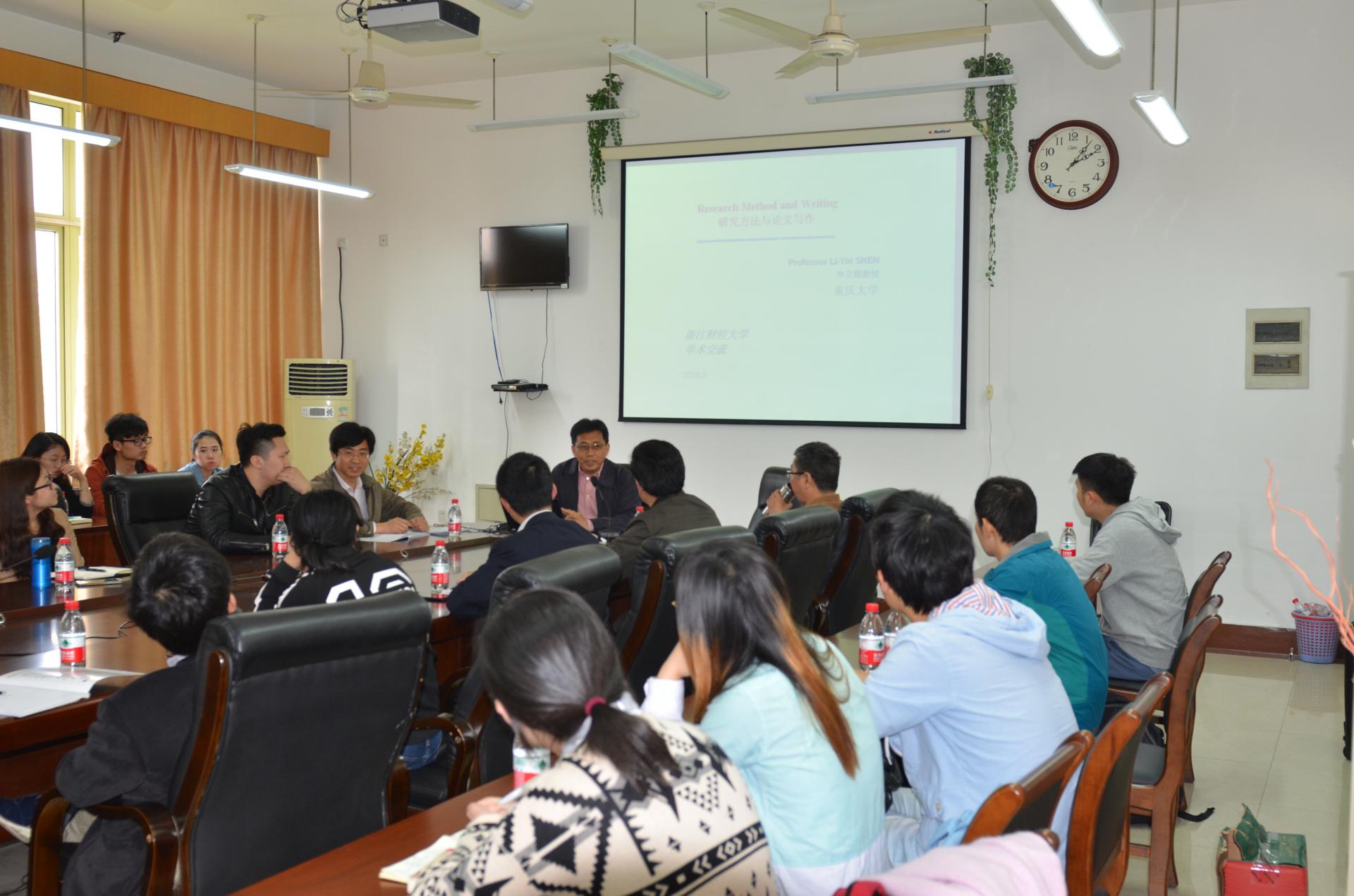 5月10日下午,工商伟德国际1946在学院楼410会议室召开了2015-2016学年第二学期第四期学术沙龙。重庆大学特聘教授、博士、博士生导师,香港理工大学申立银教授作了题为《研究方法与国际期刊论文写作交流》的主题演讲。董进才院长、黄卫华书记、学院教师、企业管理和技术经济管理专业研究生20多人参加了本次学术沙龙。学术沙龙由院长助理王建明教授主持。
