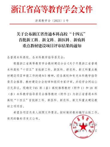 近日,浙江省高等教育学会公布省普通本科高校“十四五”新工科、新文科、新医科、新农科重点教材建设项目评审结果,我院一共10本教材获得殊荣,其中:4本教材获得“十四五”首批新文科重点教材立项,6本教材获得省教指委申报立项,取得了历史性突破。