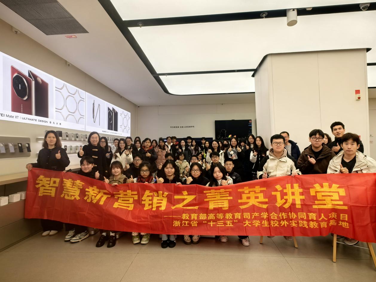 在移动课堂尾声,陈颖老师将华为门店陈列管理,与渠道策略的理论知识相结合,带领同学们将实践参访活动与课堂理论融会贯通。本次活动也得到浙江省“十三五”省级大学生校外实践教育基地、浙江省“十三五”产学合作协同育人项目的支持。