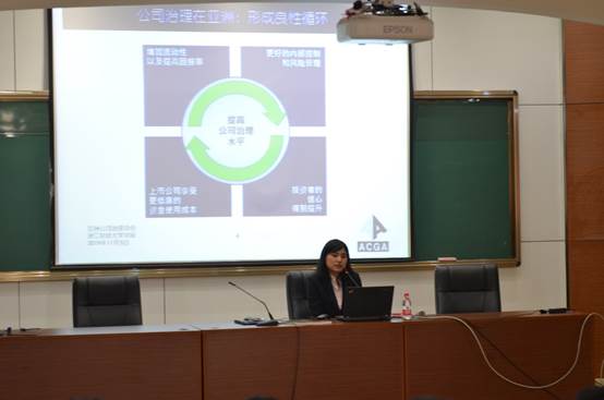 李睿研究员从“中国公司治理发展与趋势”主题切入,与同学们分享了亚洲公司治理协会(ACGA)针对中国公司治理的一项有趣研究,旨在为外国投资者解释中国独特的公司治理体系,同时也为中国的上市公司和机构投资者介绍新兴的全球公司治理最佳实践。它还包含一系列向监管机构,公司和投资者提出改进的实用建议。