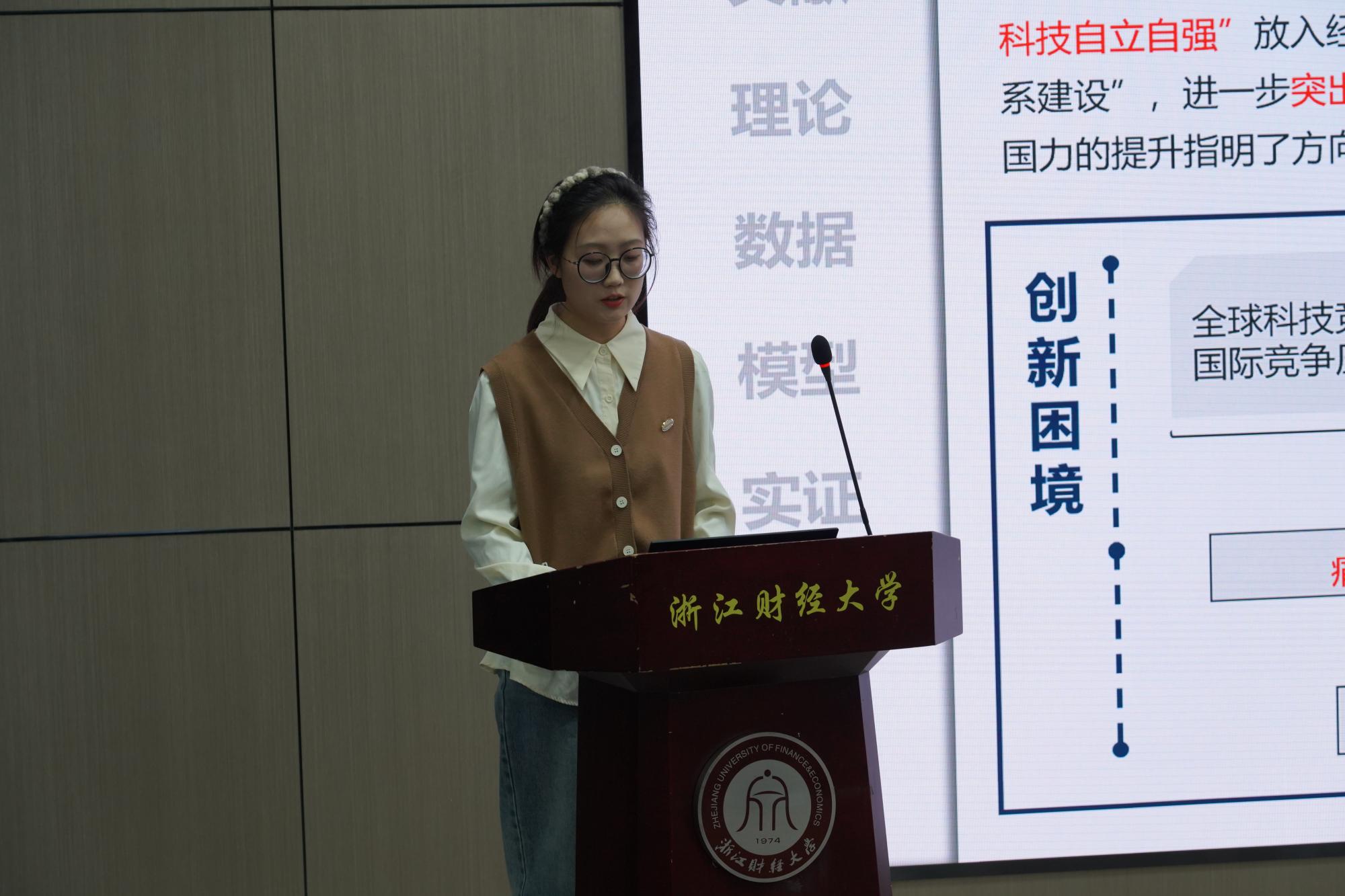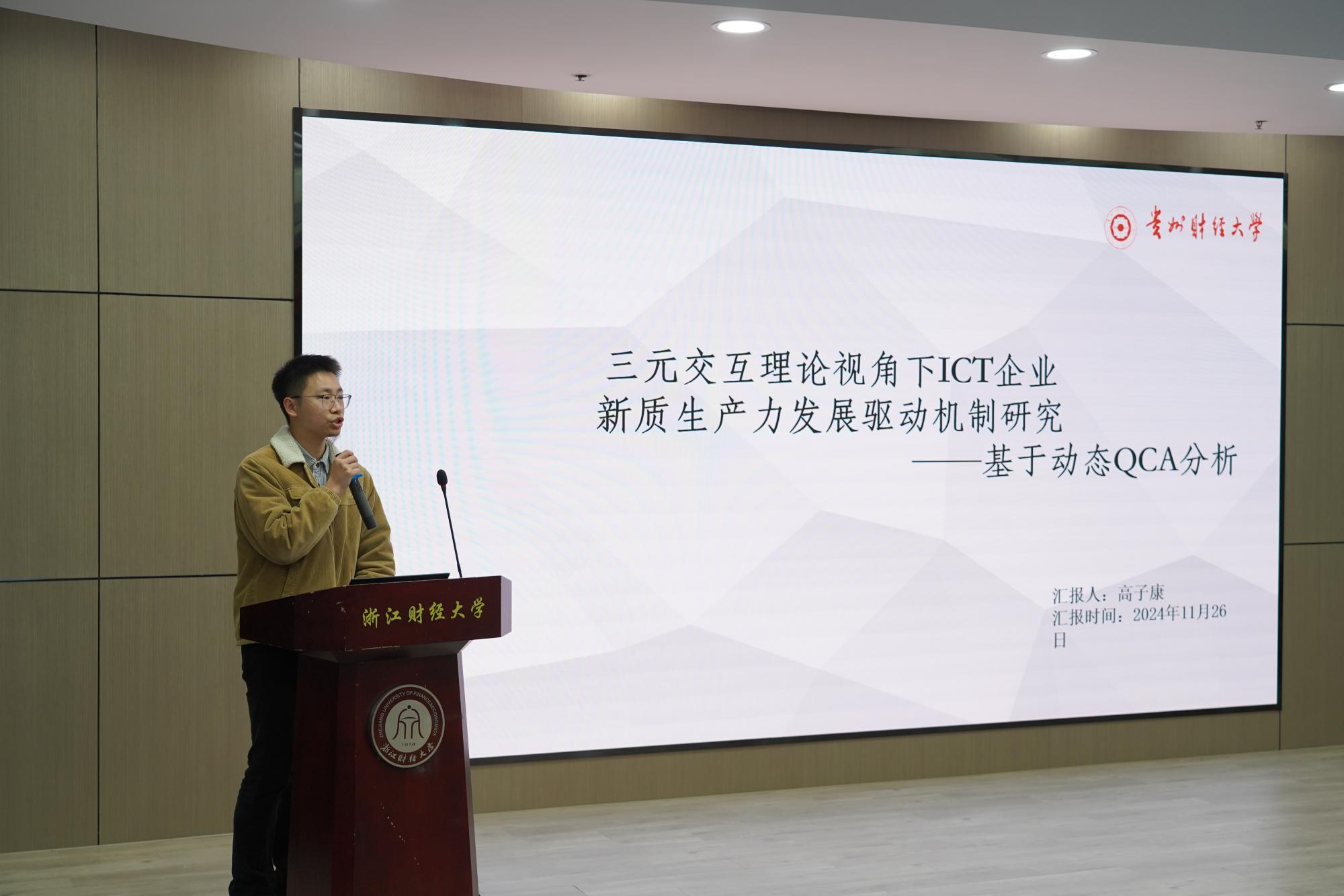 入围研究生按照抽签顺序依次上台汇报研究成果。选手们围绕新质生产力、数字化管理、企业创新发展等热点主题深入剖析,展现了深厚的学术功底与创新能力。每位选手汇报结束后,评审专家从研究方法、数据分析、论文逻辑等方面提出中肯建议,并给予鼓励和指导。