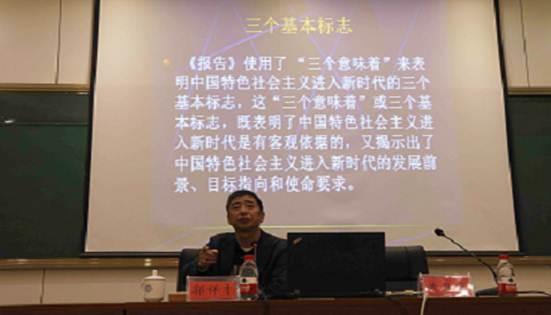 课堂上,郭教授围绕充分认识十九大的战略地位、深刻领悟十九大报告的基本思想、积极贯彻十九大的重要精神三条主线,结合自己的理解,进行了全面深刻的讲解。他认为,党的十九大的战略地位可以归纳为五个里程碑,那就是中国特色社会主义历史进程的里程碑、马克思主义中国化的里程碑、中国共产党践行伟大使命的里程碑、增强国际地位的里程碑、创造人民美好生活的里程碑;他提出,全篇报告体现了一个“新”字,并从新成就、新时代、新矛盾、新使命、新思想、新征程、新部署七个方面阐述了报告所体现的基本思想,给予大家深刻启发。以“新成就”为例,他归纳的“一个集大成、三个升级版、五个开新篇”让大家充分理解了新成就内涵,进一步坚定了道路自信、理论自信、制度自信和文化自信;最后,他指出,全面贯彻十九大精神需要切实做到统一思想,提高认识,振奋精神,鼓足干劲,明确使命,积极践行。郭教授的讲课在高度凝练、精辟分析的基础上,深入浅出、通俗易懂,为学院师生进一步领会十九大精神起到了很好的指导作用。
