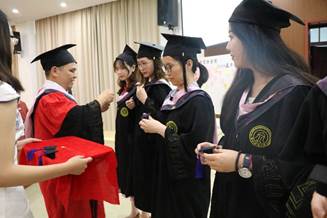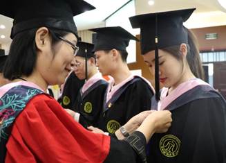 “无论走到哪里,你们都是工商伟德国际1946的优秀党员,让我们为你们最后一次佩戴党徽。”党委副书记谢敏老师和党委委员郭军灵老师为全体毕业生党员佩戴党徽。