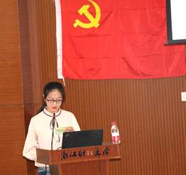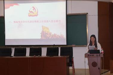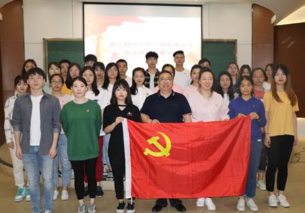 观影毕,学生第一党支部任艳秋同学代表本期新发展预备党员在党旗下宣读入党志愿书。她从自身工作和学习出发,谈了共产党员的担当和责任,表明了投身党的事业的决心和勇气。随后,全体新发展预备党员在领誓人黄卫华老师的带领下庄严宣誓。