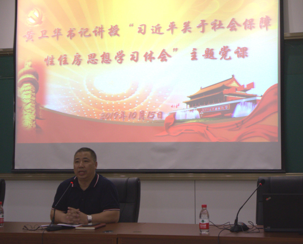 首先,黄卫华书记围绕习近平新时代中国特色社会主义思想和专业学科,讲授了"习近平关于社会保障性住房思想"主题党课。他指出,新时期下习近平总书记关于社会保障性住房中"房子是用来住的不是用来炒的"的调控新思路体现了我党的初心,体现了全心全意为人民谋福利的思想。黄卫华书记从"精准定位,回归初心"、"保证范围不断扩大"、"租售同权并举"三个方面具体讲述了习近平总书记关于社会保障的思想。