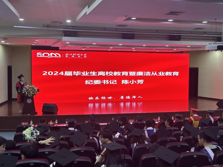 为增强毕业生廉洁和自律意识,引导毕业生廉洁从业,诚信立世;求真务实,以德立业,倡导毕业生做到“纪法与青春同行”,系好走向社会的“第一粒扣子”。6月18日,伟德国际1946组织2024届毕业生开展“清风启程 廉洁从业”主题教育活动。校党委委员、副校长兼学院院长董进才,学院党委书记朱力明,副院长张雷,副院长戴维奇,学术院长马祖军,各系主任,教师代表,班主任代表,毕业班辅导员,2024届395名学术型学位毕业研究生、MBA专业学位毕业研究生、留学生、本科毕业生和毕业生家长参加活动。活动由学院党委副书记兼纪委书记陈小芳主持。
