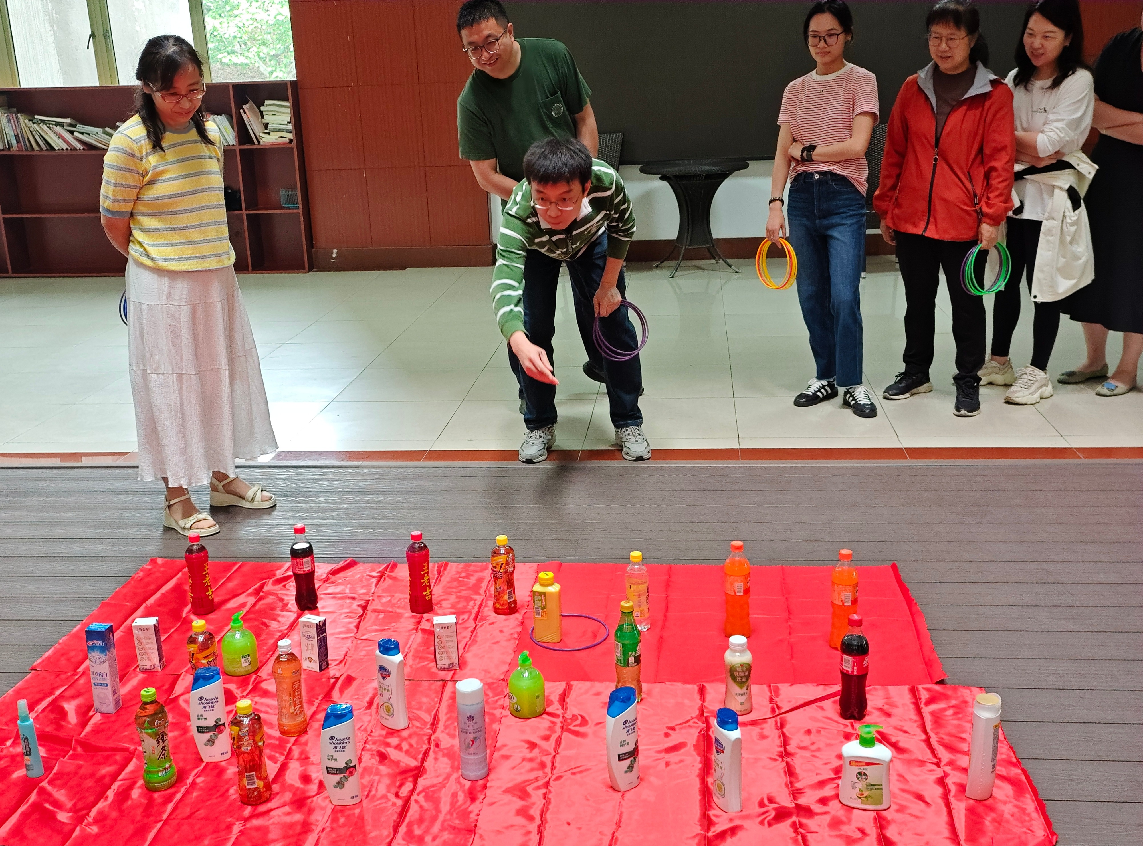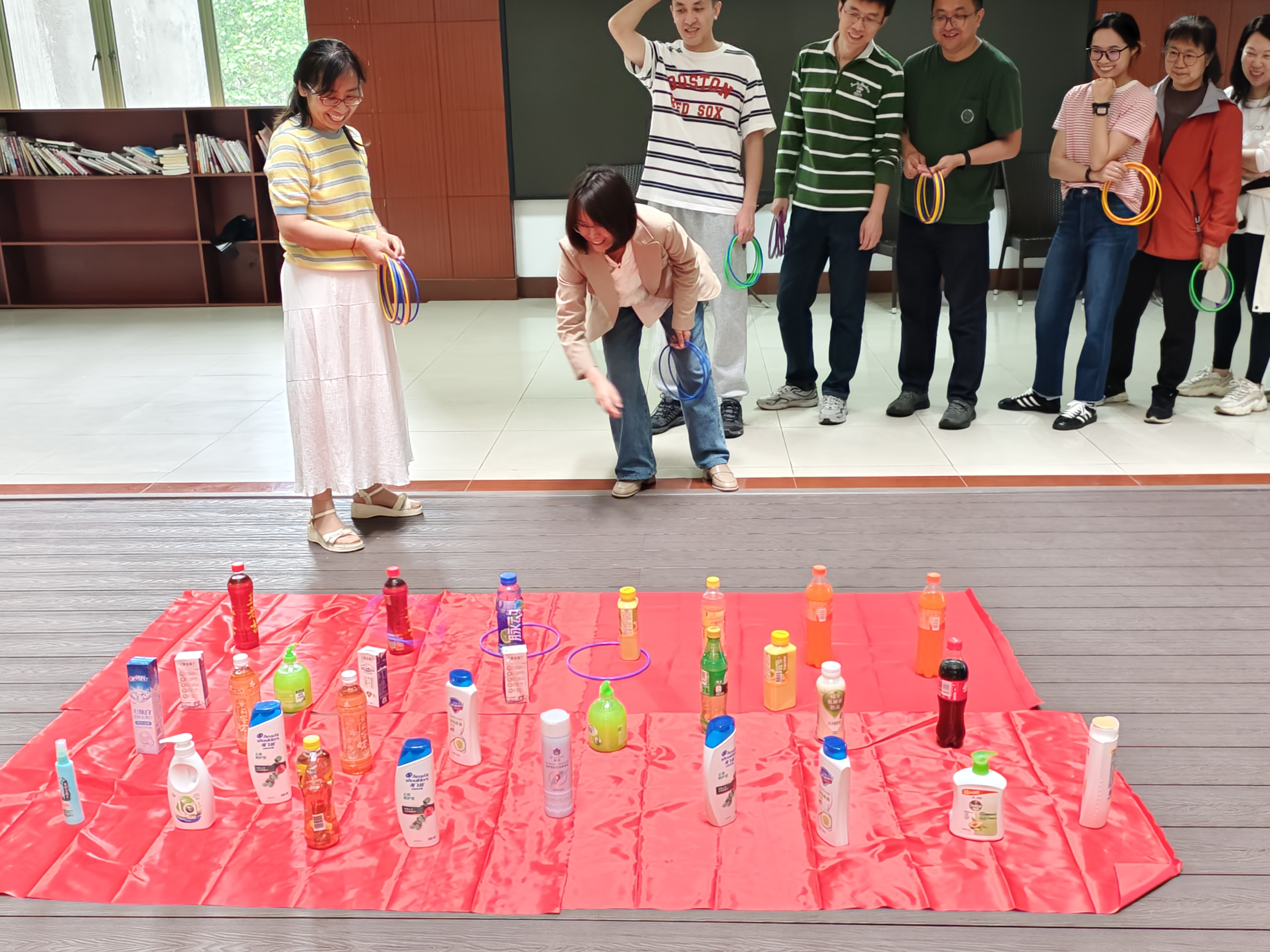 活动现场气氛热烈,老师们手持套圈,站在指定区域,全神贯注,瞄准目标,尝试将套圈套在自己心仪的物品之上。现场不时传来阵阵欢呼声、喝彩声。