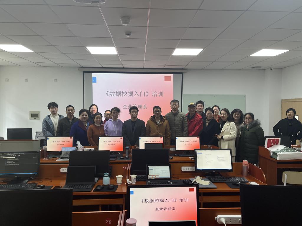 根据21级工商本科人才培养目标,侧重 “数智化、宽口径、厚基础、强应用、个性化”,培养掌握数理基础、商务数据分析能力、具备数智应用和财经思维的复合型财经人才成为紧迫要求。培养人才,教师先行,为提高教师的数智应用思维和技术,我院企管系聘请了信智学院的张林老师和姚垚老师为我院教师培训《数据挖掘入门》课程,讲解数据挖掘基本算法。来自企业管理、市场营销、人力资源管理、供应链管理系的23位教师及1名工商管理硕士研究生参加了此次培训,历时四天。本次课程主要学习了数据挖掘概述、KNN聚类算法、决策树分类算法、随机森林和人工神经网络分类算法等。在张老师和姚老师的精心准备和精彩讲解下,老师们收获满满,期待着下学期相约《数据挖掘中级》课程。