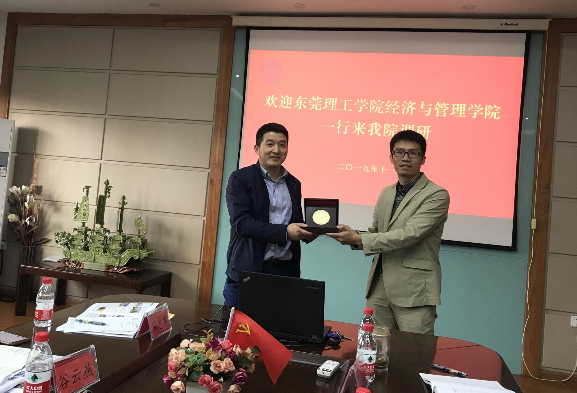 对方向我院赠送了东莞理工学院的校徽。双方合影留念。