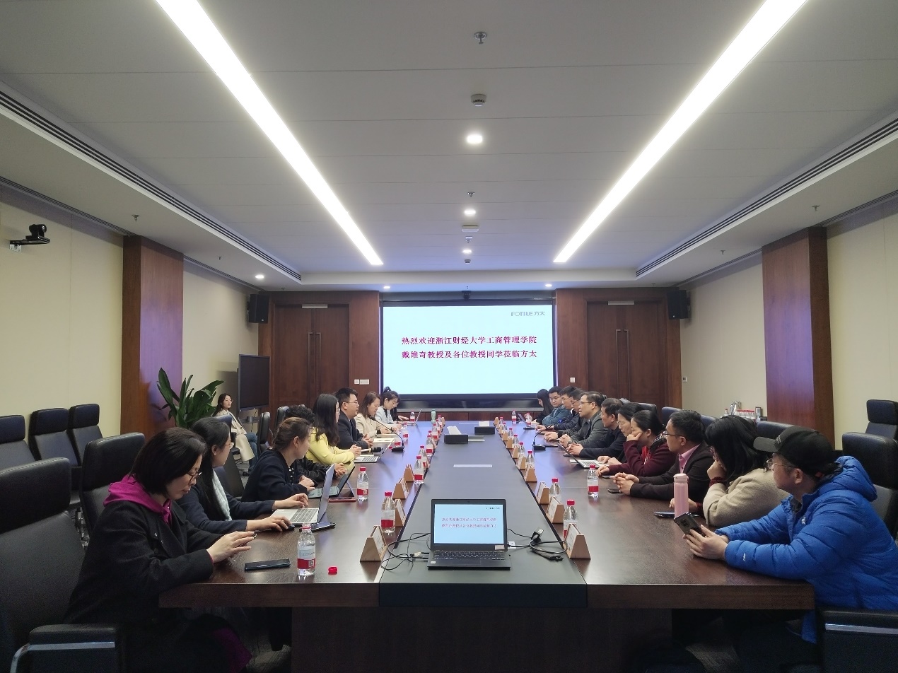 之后,调研团队与方太集团管理层开展交流会。方太文化研究院院长范斌代表方太欢迎调研团队的到来,戴维奇副院长向研究院简要介绍了伟德国际victor1946工商伟德国际1946近年来在学科科研等方面的情况以及本次调研的主题。