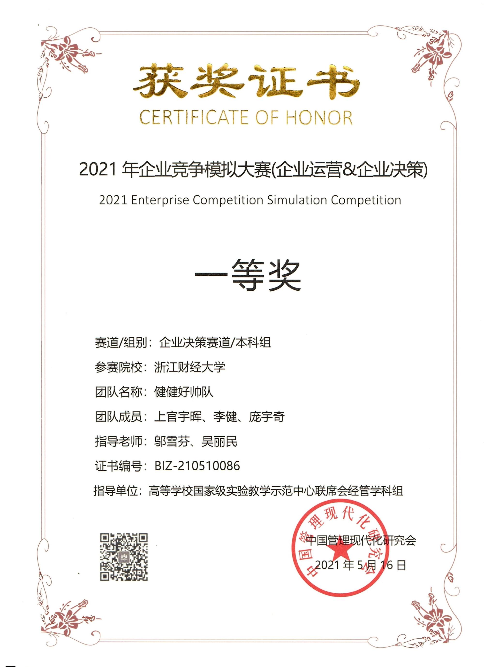 伟德国际victor1946在本次比赛中获得一个一等奖,两个三等奖,邬雪芬,吴丽民指导的“健健好帅队”组员为上官宇晖,李健,庞宇奇获得全国企业竞争模拟大赛总决赛的的一等奖。林与川老师指导的“发发发队”,组员为张振芸,楼书扬,朱裕会;裴玲玲老师指导的“Bluffing”,组员为吴梓旗,韩海鹏,孙梓娟分别获得三等奖。