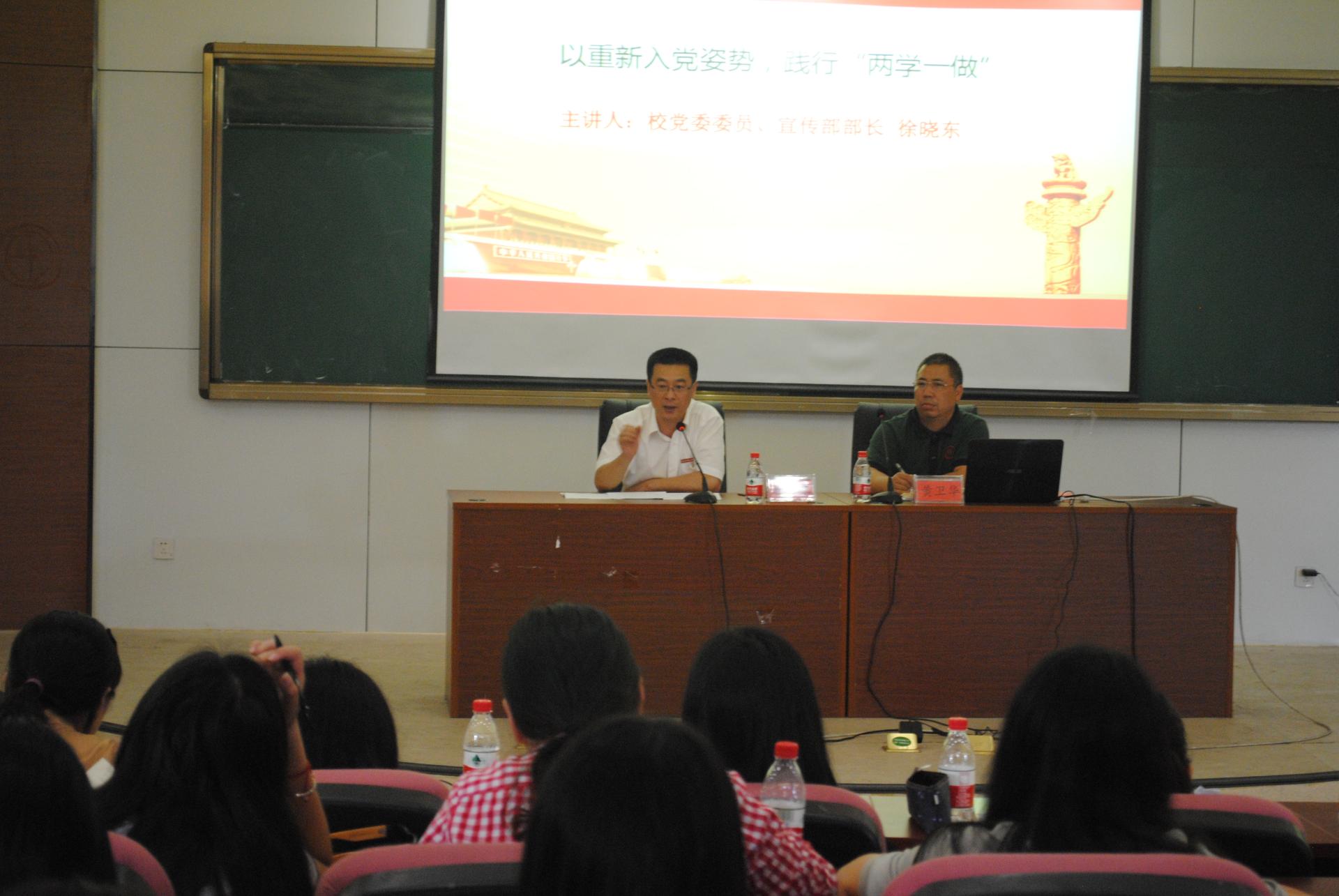 徐部长以“以重新入党姿势,践行‘两学一做’”为切入点,结合当前党员尤其是学生党员理论学习不够,党员意识淡薄,入党前表现良好入党后表现反而不尽如人意等情况,要求全体党员要按学校党委关于“两学一做“部署安排,努力落实好“两学一做”学习教育任务,切实解决好自身理论学习问题,党员意识淡薄问题,解决思想上松懈问题,工作脱离实际、不严不实等问题。
