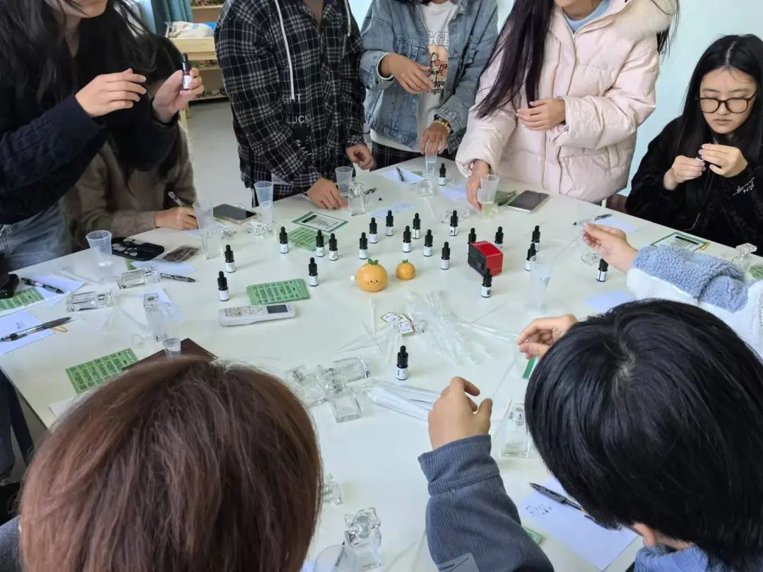 在老师的指导下,依托同学们对情绪的理解,选择了符合情绪状态的和个人审美的香油,按照前中后调特定的5:3:2的比例,选择自己喜欢的味道或符合自己情绪的精油进行调配,调制出一款适合自己的香水,最后装入香水瓶,并为自己的香水取名。