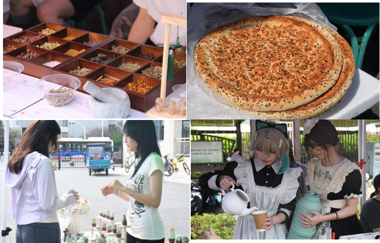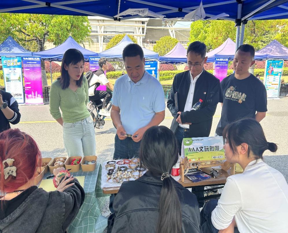 本次营销风情街在保留大学生“轻创业市集”的基础上,融入了多个创新元素,形成了三大特色展区。“π动青春・轻π创客市集”作为大学生的创业实践天地,“π”象征着轻创业项目的灵活创新,“轻π”突出低成本、低门槛的创业特性。大学生们积极响应,纷纷在校园内摆摊设点,展示创业热情与创新精神。美食摊位上,从传统中式点心到西式甜点,从地方特色小吃到创意饮品,琳琅满目。学生们巧妙利用“互联网 +”时代特色,精心设计菜单和摊位装饰,以独特的美食文化吸引顾客。饰品和手工艺品区域同样精彩,精美的穿戴甲、闪亮的首饰、绘画作品、陶瓷手作等凝聚着创作者的心血,彰显多样美学理解,引得师生纷纷驻足欣赏,不少人还在互动体验活动中亲手尝试DIY。部分摊位更是将部分收益投入公益活动,展现了当代大学生的社会责任感。