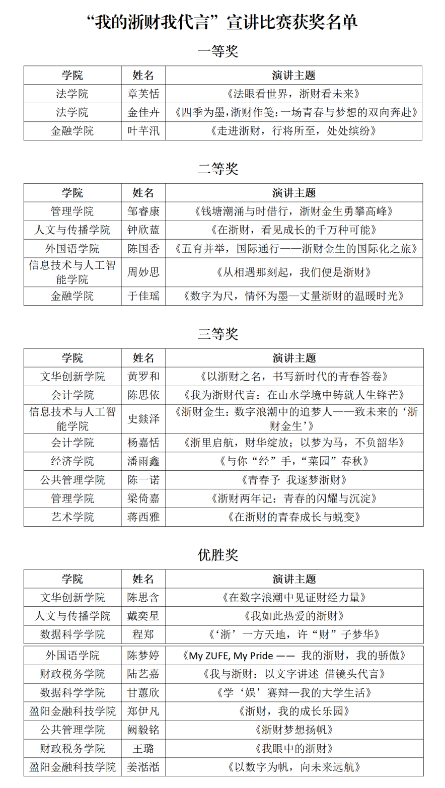 我院邹睿康同学的作品《钱塘潮涌与时借行,浙财金生勇攀高峰》以独特的视角、丰富的内容和出色的发挥,多角度呈现了浙财充实的校园生活,斩获二等奖;我院梁倚嘉同学以作品《浙财两年记:青春的闪耀与沉淀》结合自己丰富的校园生活与感悟、动人的成长故事与精彩的现场感染力斩获三等奖。