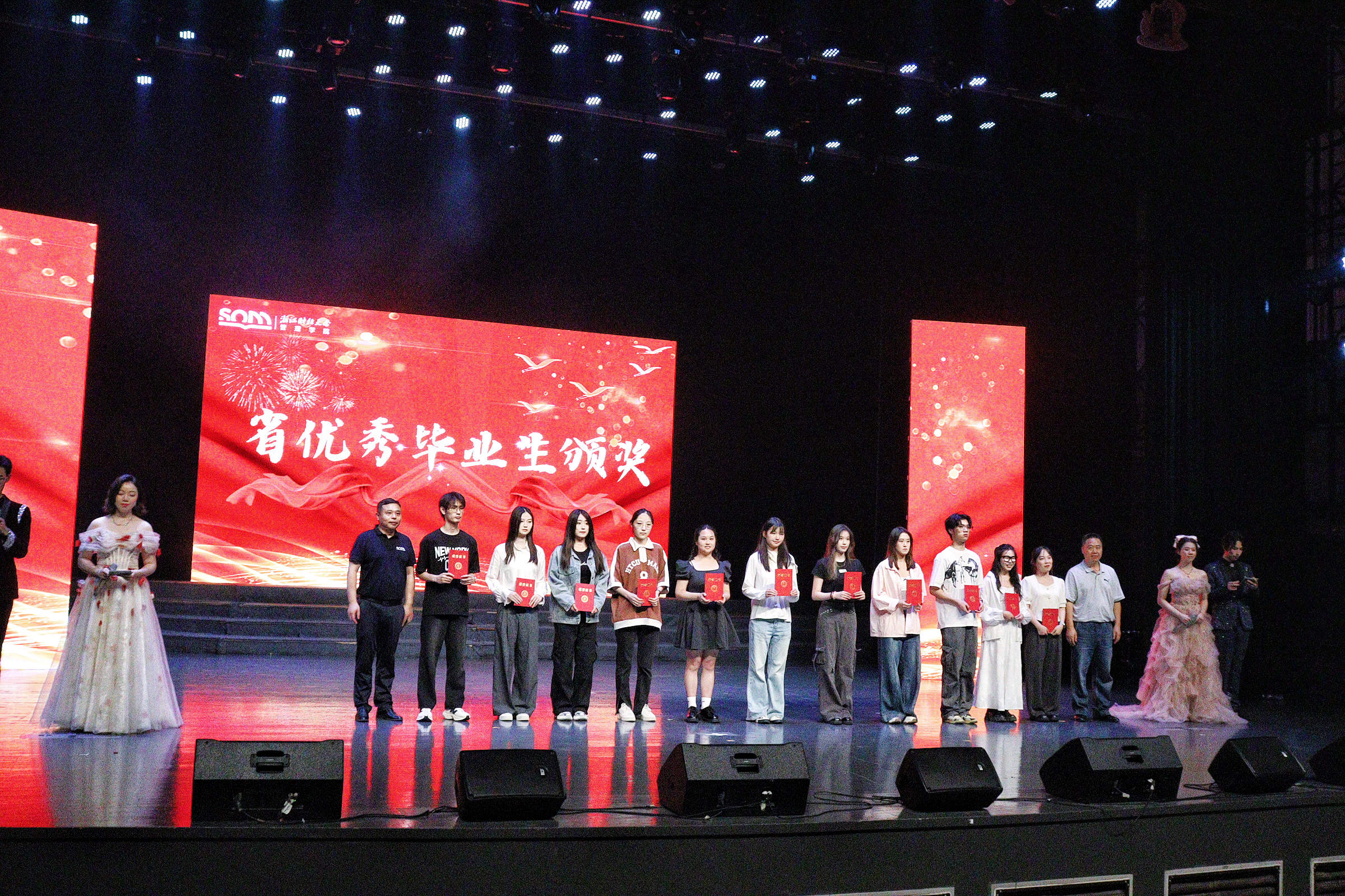 晚会现场还举行了优秀毕业生颁奖仪式,伟德国际1946党委书记朱力明、执行院长董直庆为省优秀毕业生和校优秀毕业生颁发了荣誉证书,表彰他们在大学期间的优异表现和突出贡献,激励全体毕业生以他们为榜样,在未来的道路上勇创佳绩。