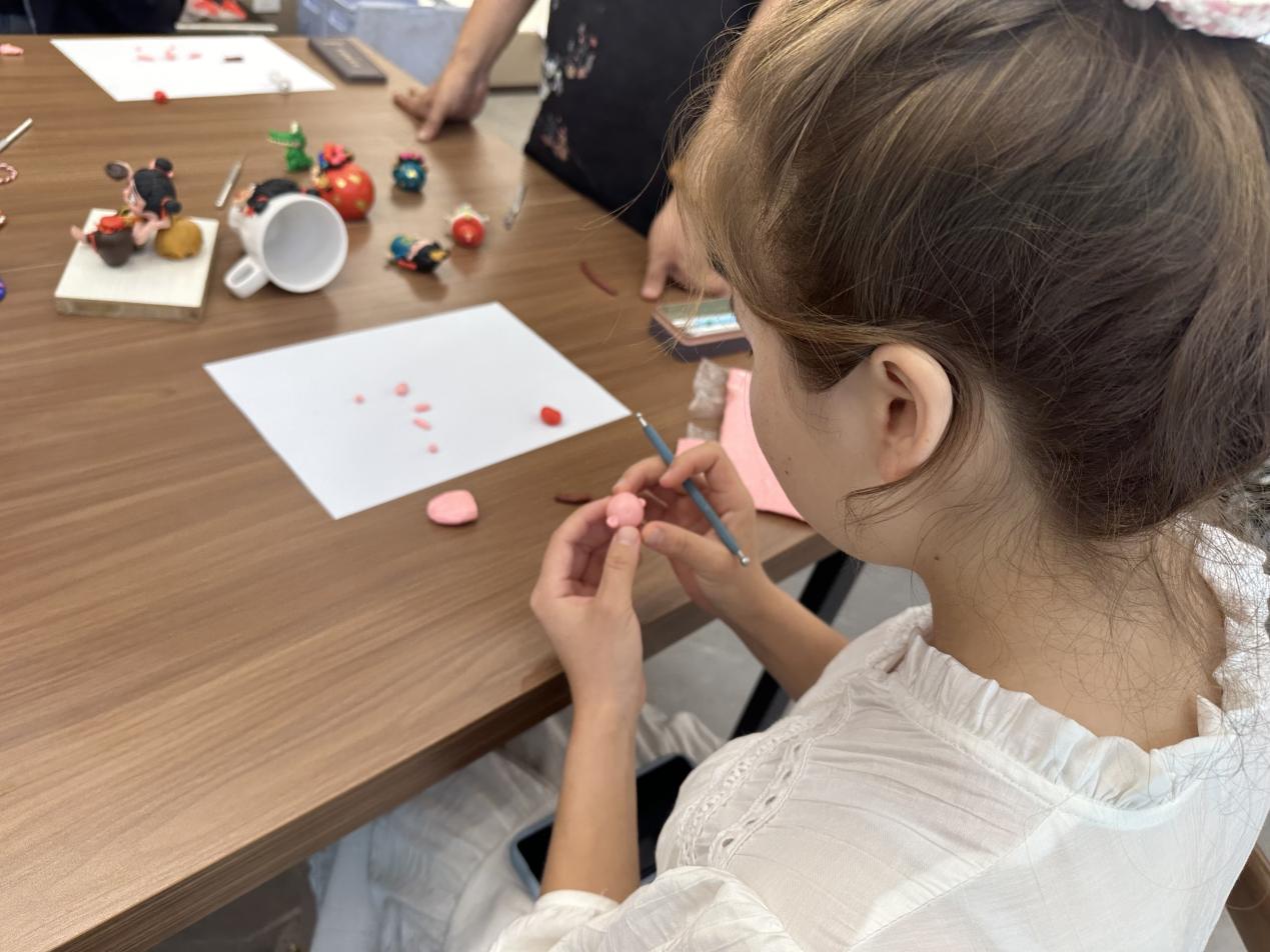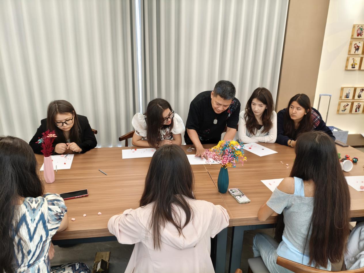 非遗传承人丁建华老师深入浅出地讲解黏土捏塑的历史与技法,揉、搓、捏、刻,每一个动作都充满神韵,在示范捏制哪吒形象时,传承人从哪吒标志性的乾坤圈、混天绫,到独特的发型、神态,都进行了细致入微的展示,引得在场学生们跃跃欲试,新疆少数民族学生们围坐在传承人身边,眼神中满是对这门古老技艺的好奇与期待,他们认真聆听,不时拿起工具尝试模仿,现场气氛热烈非凡。