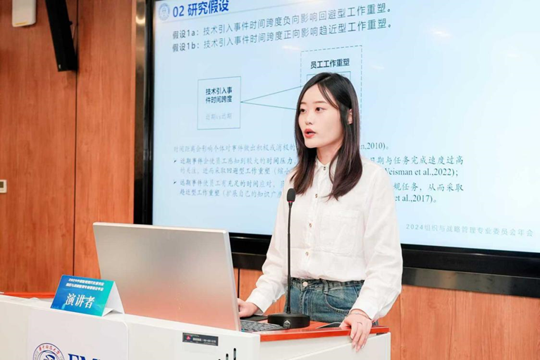 我院研究生李梦甜在平行论坛上作了论文汇报——《变革背景下技术引入事件对员工工作重塑的影响》。文章基于事件本身的多层次动态视角,从“情境-知觉-行为”的研究脉络出发,结合事件系统理论与解释水平理论,探讨技术引入事件属性如何触发员工趋近型和回避型工作重塑行为。基于两项实验研究,研究发现技术引入事件的时间距离会对两类不同的工作重塑产生影响,并且解释水平和事件的强度也会在其中发挥作用。